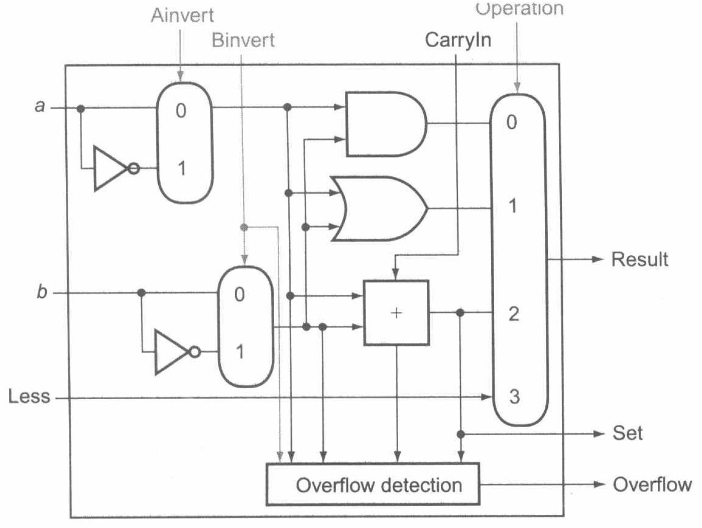同时,由于每次使用 ALU 做减法时,要将 CarryIn 和 Binvert 都设置为 \(1\),其余时候都设置为 \(0\)。因此也常将这两条控制线合成为一条控制线 Bnegate。于是最终的完整 ALU 如下: