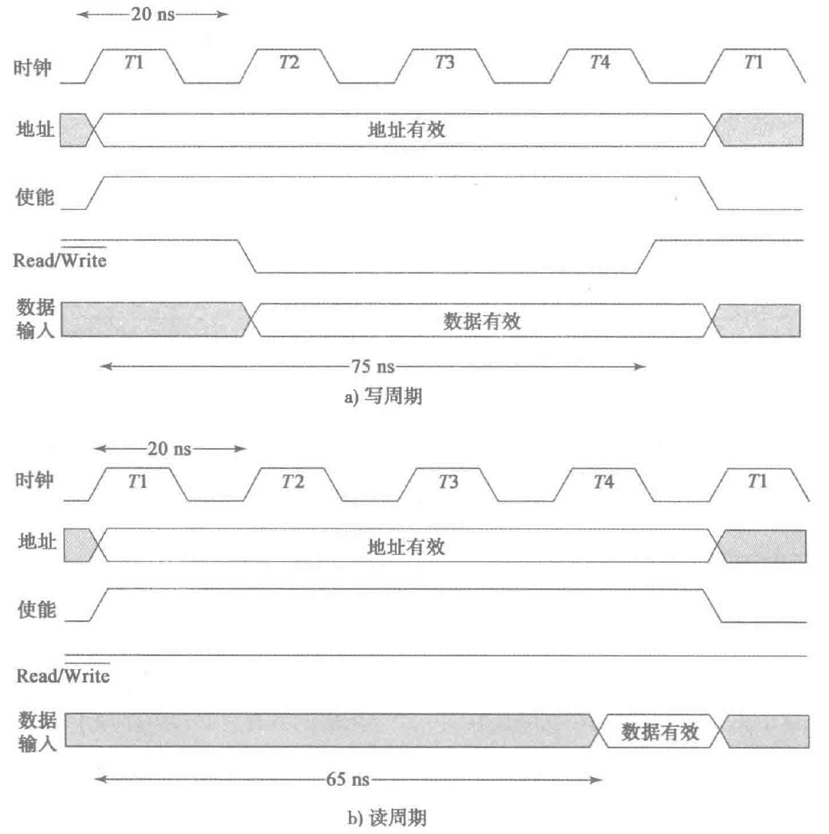 存储器的读操作访问时间 (access time) 为从地址请求到数据输出的最大时间间隔,而写周期时间 (write cycle time) 为从地址请求到完成存储一个字所需的所有存储器内部操作的最大时间间隔。存储器写操作可以在时钟周期间隔内连续进行,CPU 必须在它的内部时钟与存储器读写操作同步的情况下提供存储器控制信号。这就要求存储器的访问时间和写周期时间必须等于 CPU 时钟周期的固定倍数。